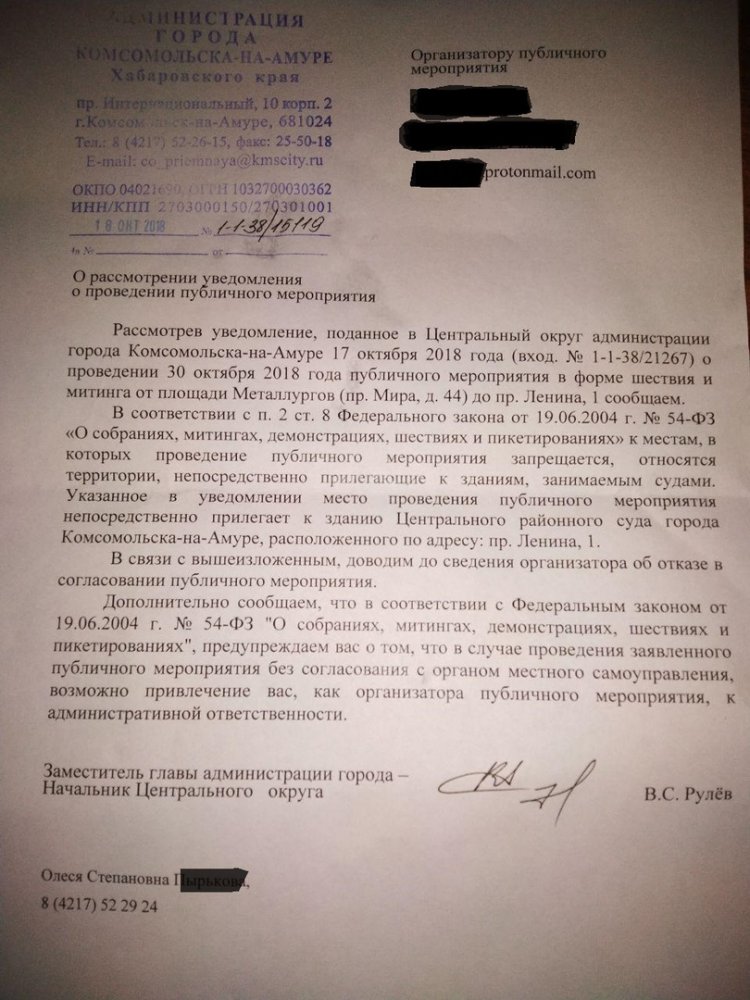 В ответе из администрации города указали, что территория, возле которого планировалась акция, прилегает к зданию районного суда, где, в соответствии с Федеральным законом, запрещены массовые мероприятия. Митинг должен был пройти 30 октября возле памятного знака жертвам политических репрессий, установленного местным отделением «Мемориала» в 1990 году.