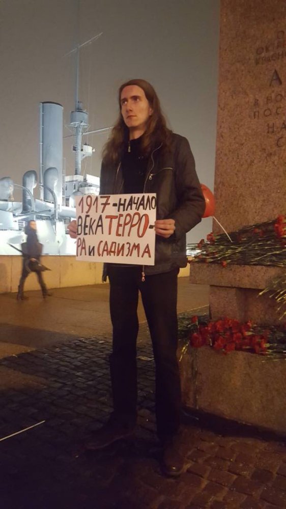 По его словам, Ткаченко держал плакат, на котором было написано: «1917 — начало века террора и садизма». Полицейские не назвали причин задержания. Ткаченко везут в 43 отдел полиции.