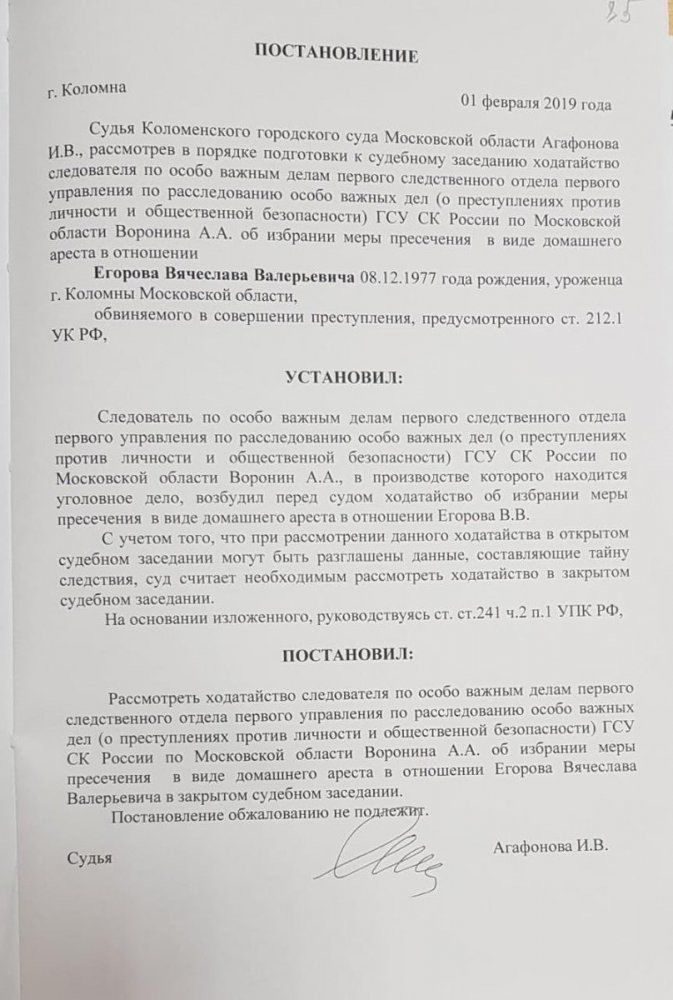 Следователь просит суд отправить Егорова под домашний арест. Судья, как следует из публикуемого ниже постановления, распорядилась рассмотреть ходатайство следствия в закрытом режиме. ОВД-Инфо недавно публиковал материал о том, как судьи безосновательно не пускают адвокатов и посетителей на заседания.