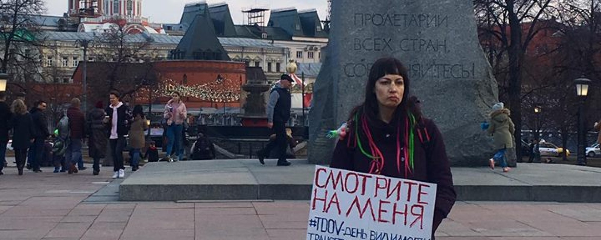 Задержанную привезли в отдел полиции «Китай-город». У нее забрали плакат, на котором было написано «Смотрите на меня. #TDOV — День видимости трансгендерных людей». В настоящий момент она пишет объяснительную.