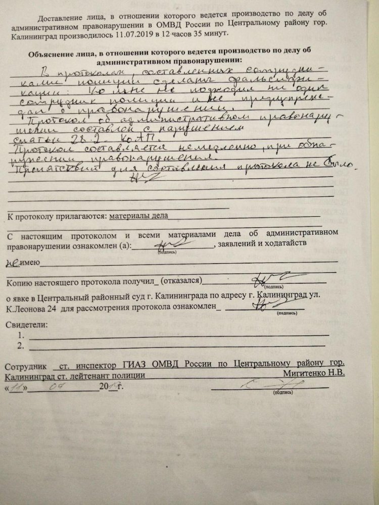 По акции 6 июля Центральный районный суд Калининграда также присудил штрафы главе профсоюза «Альянс врачей» Анастасии Васильевой на 20 тысяч рублей по ч. 2 ст. 20.2 КоАП (организация публичного мероприятия без подачи уведомления), ее заместителю Владимиру Сотникову на 10 тысяч рублей по ч. 5 ст. 20.2 КоАП (нарушение правил проведения публичного мероприятия). Оператора Павла Зеленского доставляли в отдел полиции, но отпустили без протокола.