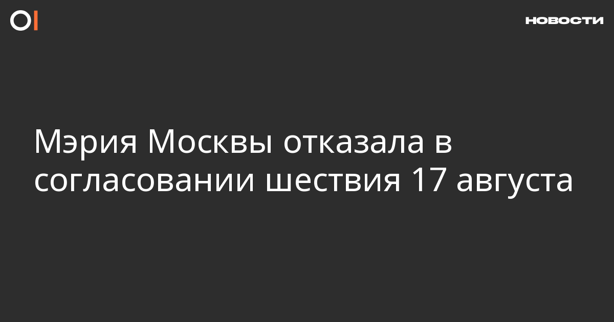 Мэрия Москвы отказалась рассматривать заявление о проведении шествия по Страстному бульвару 17 августа. Об этом сообщает «Коммерсант». Информация подтверждается в фейсбуке одного из организаторов акции, главы муниципального округа Якиманка Андрея Морева.