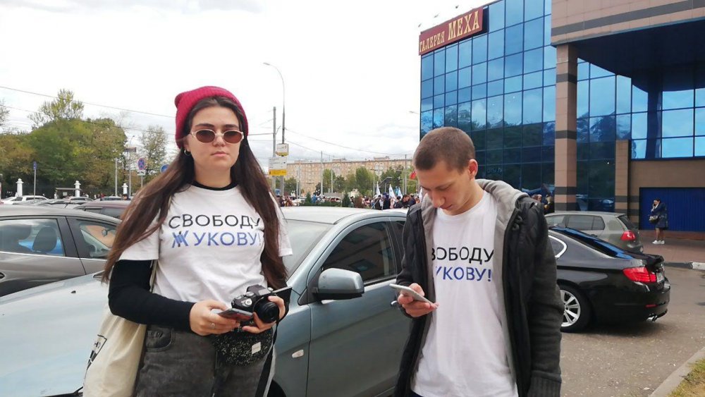 После этого их и корреспондентку DOXA Татьяну Колобакину отвели в автозак. У Колобакиной на сумке была небольшая наклейка «Свободу Жукову».