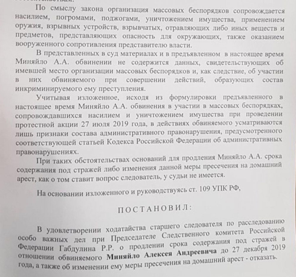 16:12 «В материалах дела не содержится данных, свидетельствующих об имевшей место организации массовых беспорядков и, как следствие, об участии в них обвиняемого», — сказано в решении суда. Нынешнее решение формально не является снятием обвинения с Миняйло, как ошибочно было сказано в новости ранее. В настоящее время Миняйло отправился в Следственный комитет.