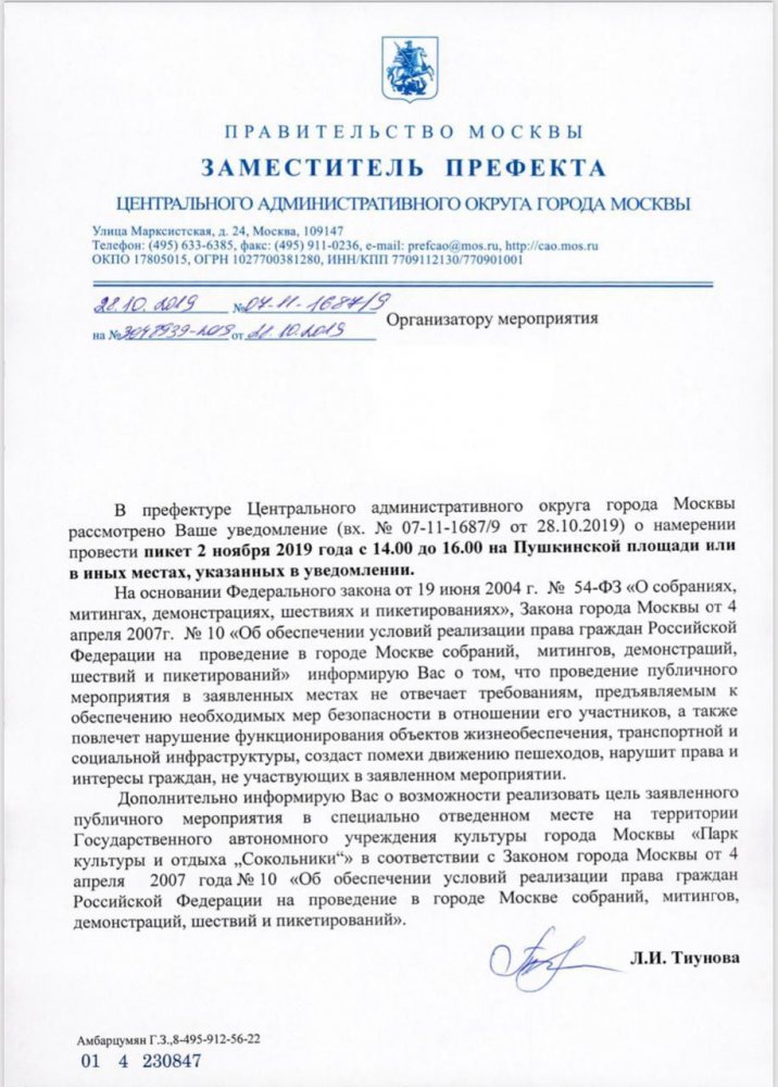 В префектуре посчитали, что предложенные организаторами акции варианты не отвечают требованиям безопасности, поэтому проведение акции в предложенных местах повлечет нарушение прав лиц, не участвующих в мероприятии. Чиновники предложили провести акцию в гайд-парке «Сокольники».