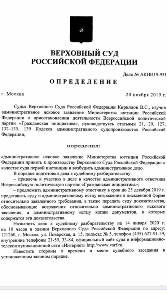 Минюст обратился в Верховный суд России с требованием приостановить деятельность партии «Гражданская инициатива». Об этом бывший председатель партии Андрей Нечаев сообщил на своей странице в фейсбуке.