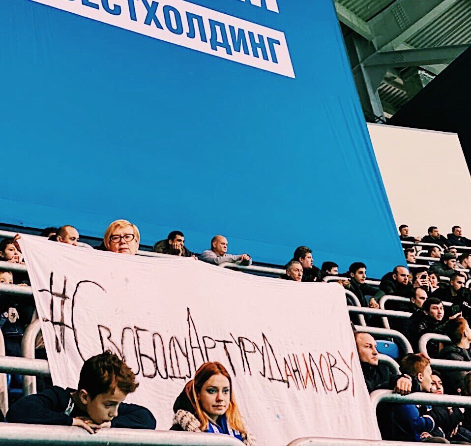 В Санкт-Петербурге семью осужденного по статье о применении не опасного для здоровья насилия к силовику (ч. 1 ст. 318 УК) Артура Данилова вывели с футбольного стадиона после того, как они развернули плакат. Об этом сообщается на странице фанатов футбольного клуба «Зенит» в твиттере.