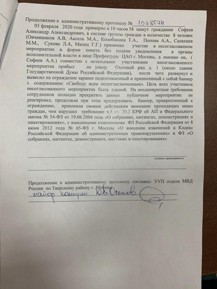 «Цель всех участников была единой. На неоднократные требования сотрудников полиции прекратить данное публичное мероприятие не реагировал, продолжая при этом придерживать баннер, прикрепленный к ограждению, привлекая своими действиями внимание проходящих мимо граждан», — пишут сотрудники полиции в протоколе.