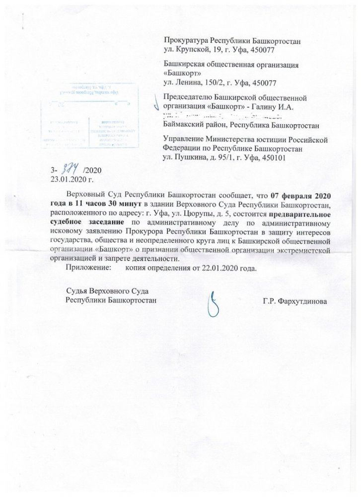 Организация опубликовала на своей странице во «ВКонтакте» уведомление из Верховного суда республики Башкортостан о том, что 7 февраля состоится предварительное заседание по иску прокурора. В группе отметили, что если суд встанет на сторону Прокуратуры, то «Башкорт» станет первой башкирской национальной организацией, признанной экстремистской.