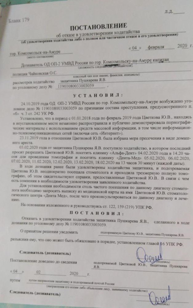 В Комсомольске-на-Амуре дознаватель отказалась удовлетворить ходатайство ЛГБТ-активистки Юлии Цветковой с просьбой разрешить ей несколько раз посетить врача-стоматолога. Об этом ОВД-Инфо сообщила мать Цветковой Анна Ходырева.
