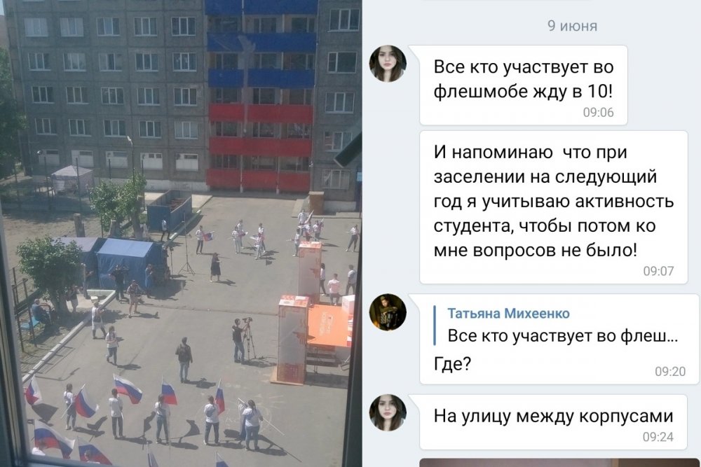 Студентов Алтайского государственного университета вынудили участвовать во флешмобе ко Дню России под угрозой выселения из общещития, пишет «Сибирь. МБХ медиа» со ссылкой на студента Якова Веху.