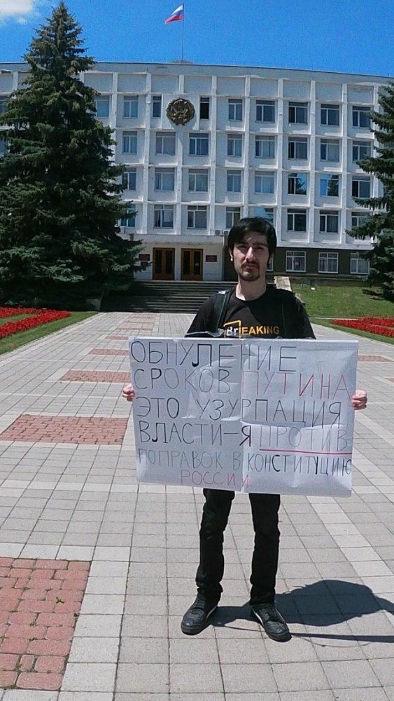 Айрапетян стоял с плакатом против обнуления президентских сроков рядом с мэрией города. Пока неизвестно, по какой именно статье составили протокол.