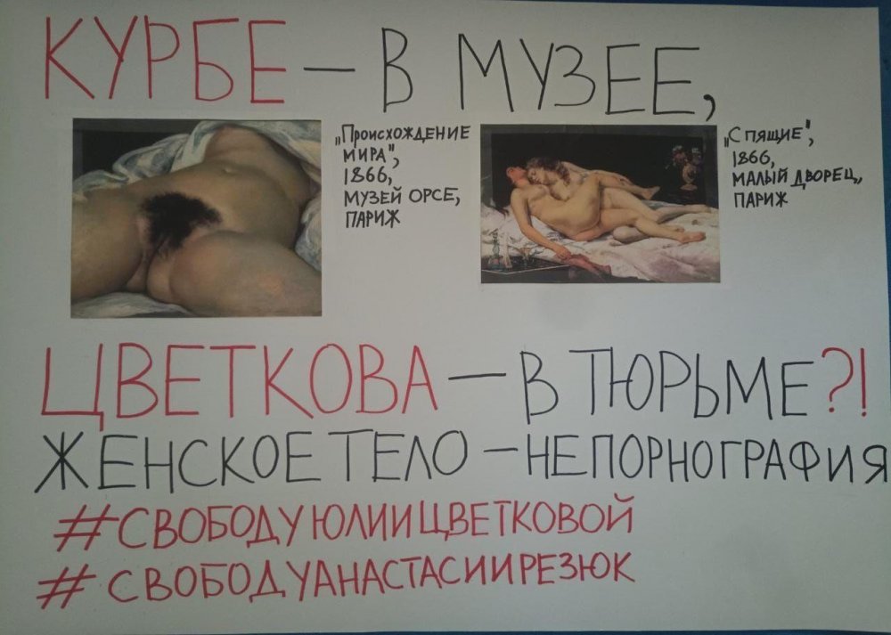 17:40 На плакате Ксении Самариной — репродукции картин Гюстава Курбе «Происхождение мира» и «Спящие». Полицейские угрожали пикетчице статьями о порнографии, передает старший юрист ОВД-Инфо Надежда Кузина.