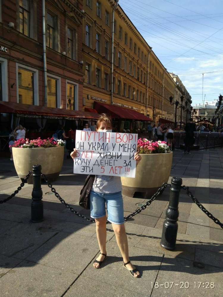 Ковалец стояла в пикете с плакатом «Путин — вор! Он украл у меня 5 лет жизни и кучу денег за эти 5 лет!!!». Предварительно, ее доставят в 78 отдел полиции.