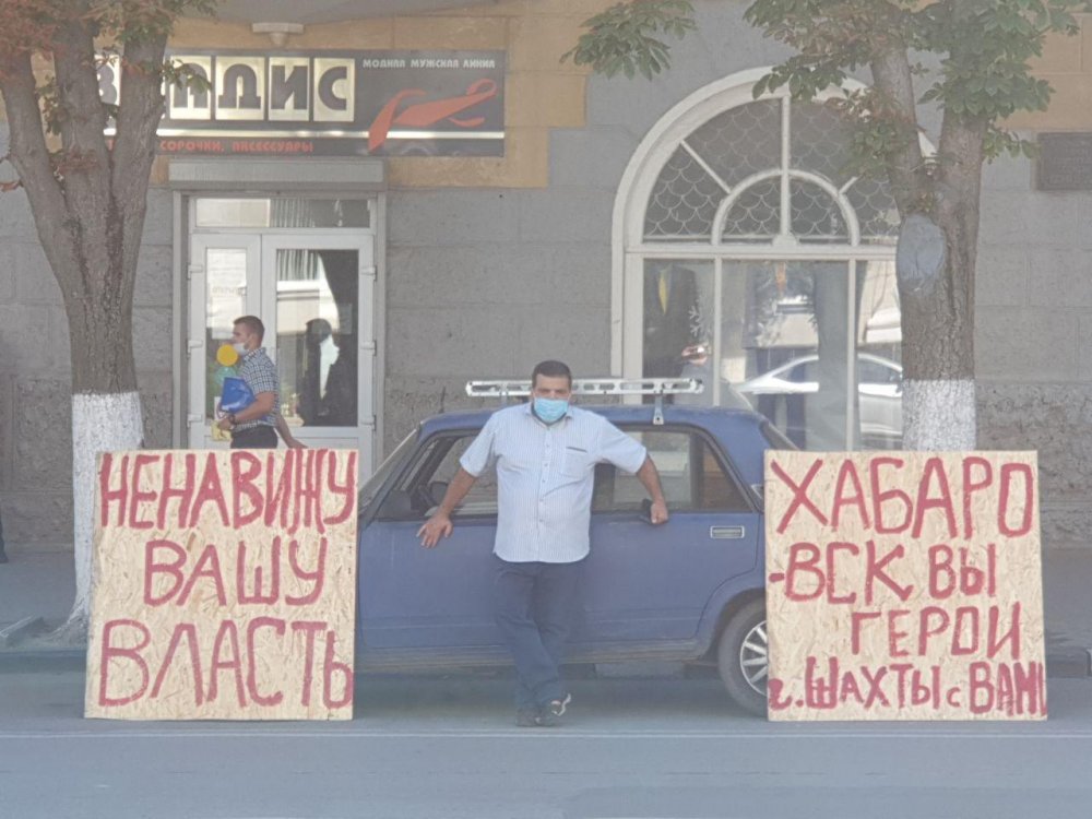 В Шахтах Ростовской области задержали участника одиночного пикета в поддержку протестующих в Хабаровском крае. Об этом ОВД-Инфо сообщил очевидец.