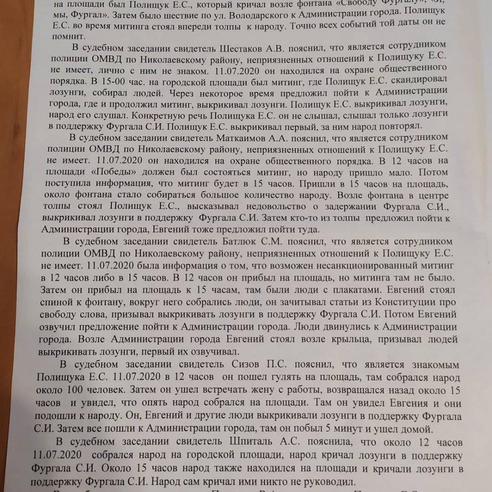 Судья Федоренко признала Полищука виновным по статье об организации публичного мероприятия без подачи уведомления (ч. 2 ст. 20.2 КоАП). По версии полиции, Полищук крикнул во время митинга «Пойдем на администрацию!» — и все участники акции пошли за ним.
