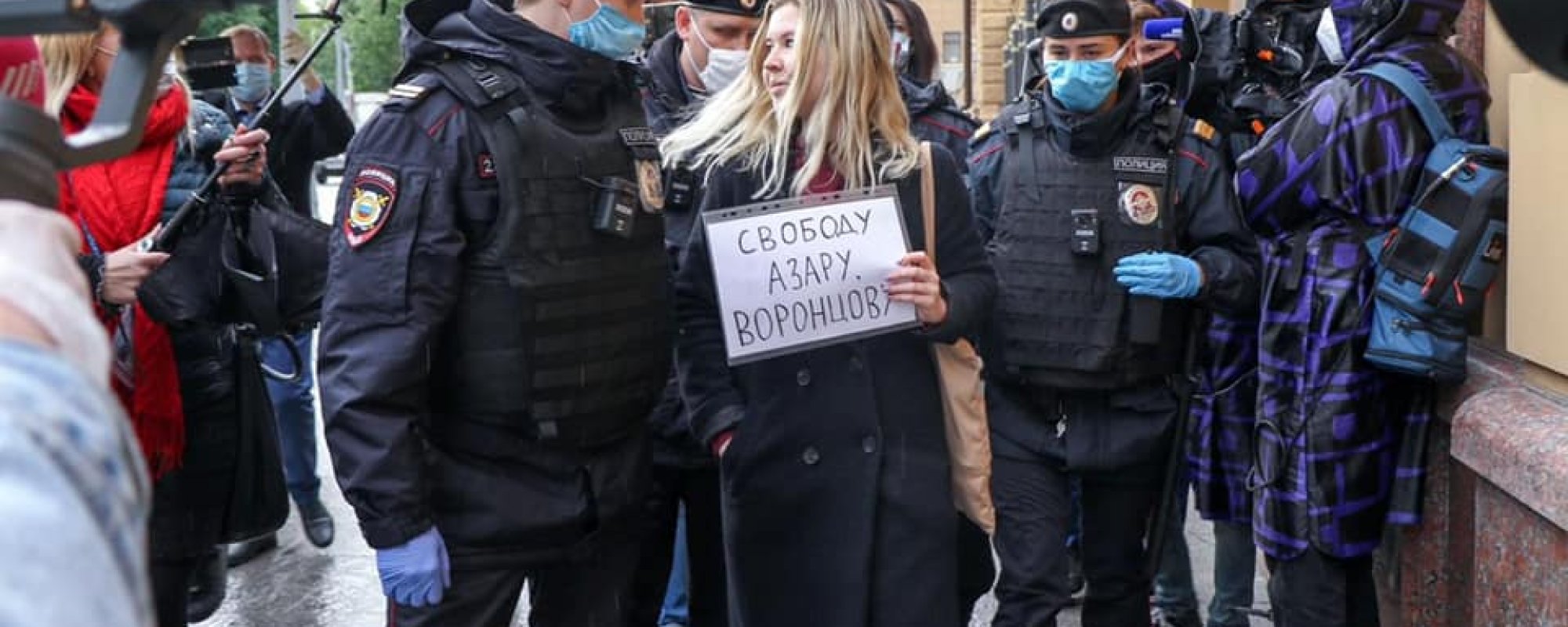 Активистке вменили акцию в поддержку журналиста Ильи Азара и против преследования Владимира Воронцова, которая прошла 1 июня на Петровке, 38.