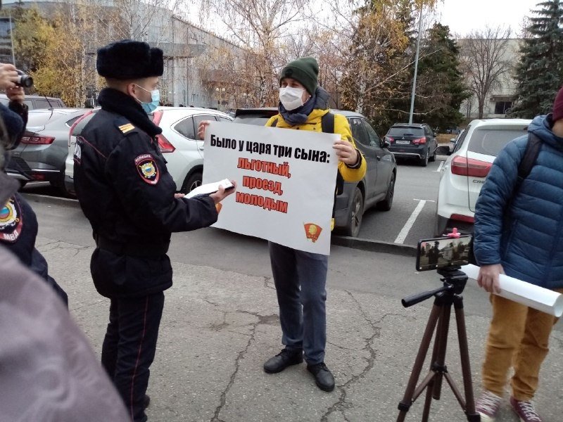 Акцию провели активисты «Ленинского комсомола» — молодежного крыла КПРФ. Участники пикетной очереди потребовали отменить повышение тарифа на проезд в общественном транспорте и введения льгот для школьников и студентов.
