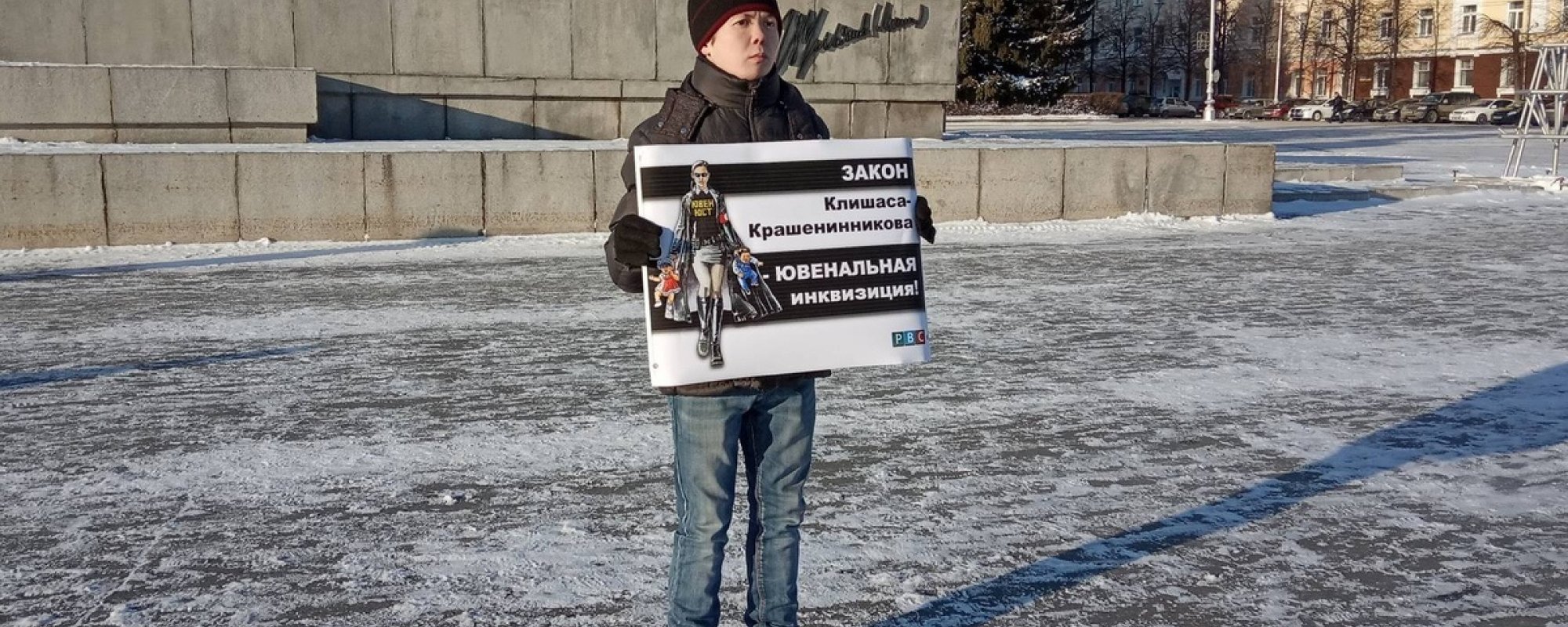 Евгений Найман вышел на площадь Ленина в Кургане на пикет против законопроекта Андрея Клишаса и Павла Крашенинникова. Чиновники предлагают создать в России систему «ювенальных судов», которые упростили бы процедуру изъятия детей из семьи органами опеки. На плакате Наймана написано: «Закон Клишаса — Крашенинникова — ювенальная инквизиция!».