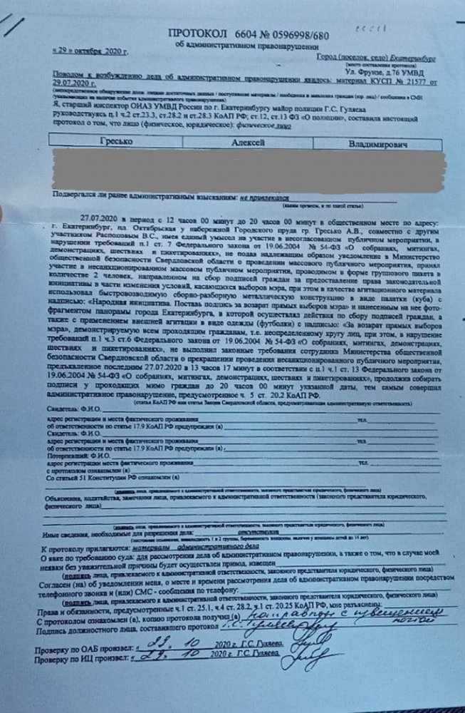Протокол по статье о нарушении порядка проведения публичного мероприятия (ч. 5 ст. 20.2 КоАП) активист получил по почте. Как указано в бумагах, полиция расценила сбор подписей 27 июля как несогласованный массовый пикет с использованием сборно-разборной конструкции.