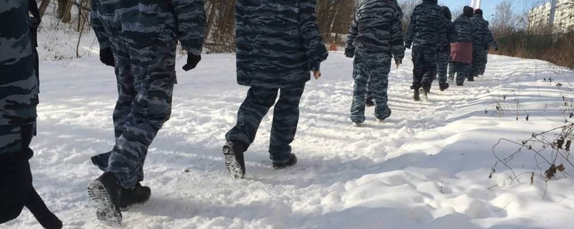 Участники в одежде, похожей на форму сотрудников ОМОН, охраняли слово «Свобода», которое нарисовано крупными буквами на снегу.