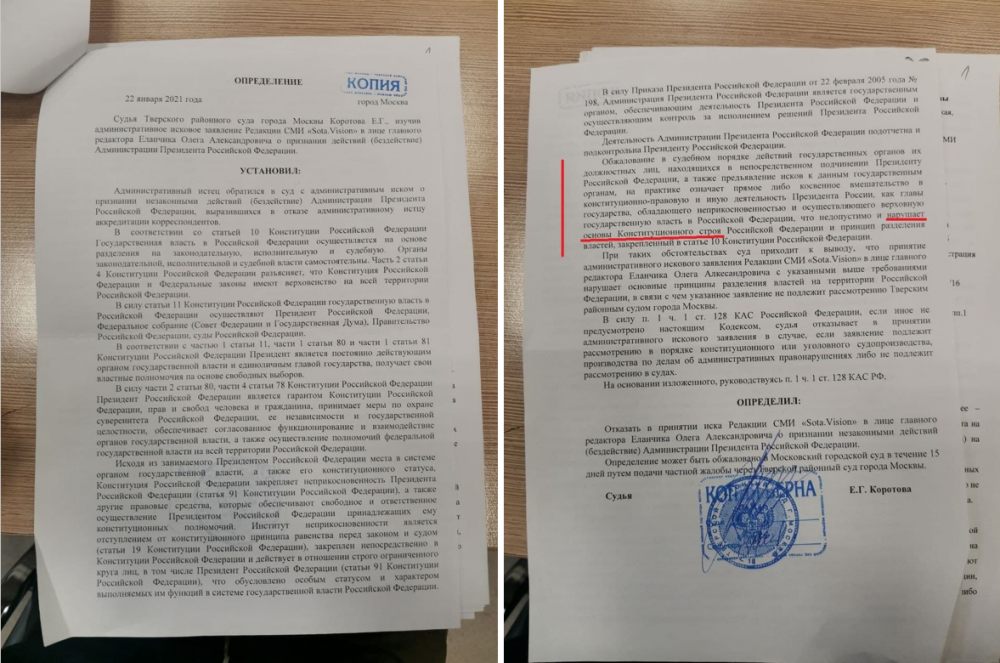 В Москве суд отказался принять административное исковое заявление издания Sota, которое обжаловало отказ в аккредитации на пресс-конференцию президента России. Об этом Sota сообщила в своем телеграм-канале.