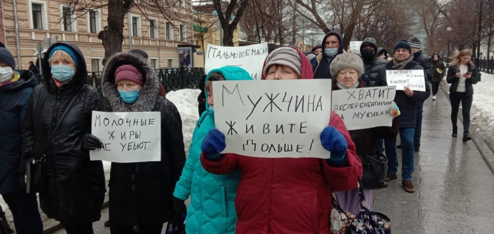 Акцию провела организация «Здоровая еда». По словам Усмендеева, основное требование мероприятия — бесплатно выдавать мужчинам еду с пальмовым маслом, чтобы победить мужскую смертность. Организация считает пальмовое масло источником полезных жиров.
