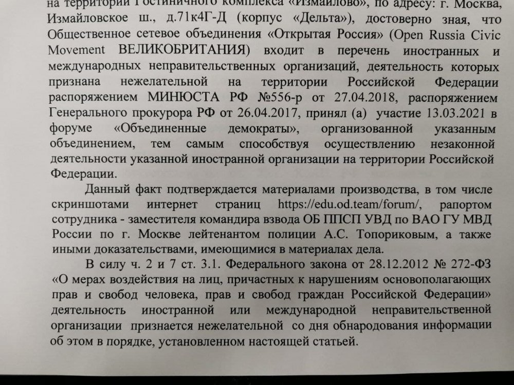 18:40 Задержанных постепенно отпускают из отделов полиции с протоколами, составленными «под копирку». Из постановлений о возбуждении административного дела следует, что активистам вменяют участие в деятельности Open Russia Civic Movement (организация, зарегистрированная в Великобритании и признанная в 2017 году в России нежелательной). По версии прокурора, такое участие подтверждается, в частности, скриншотами сайта о форуме «Муниципальная Россия», организаторами которого значится движение «Объединенные демократы».