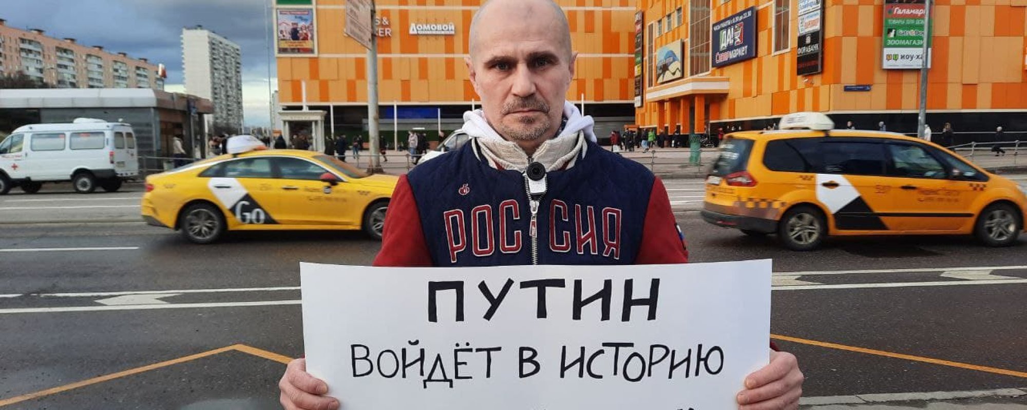 Куок стоял с плакатом «Путин войдет в историю убийцей Навального free.navalny.com».