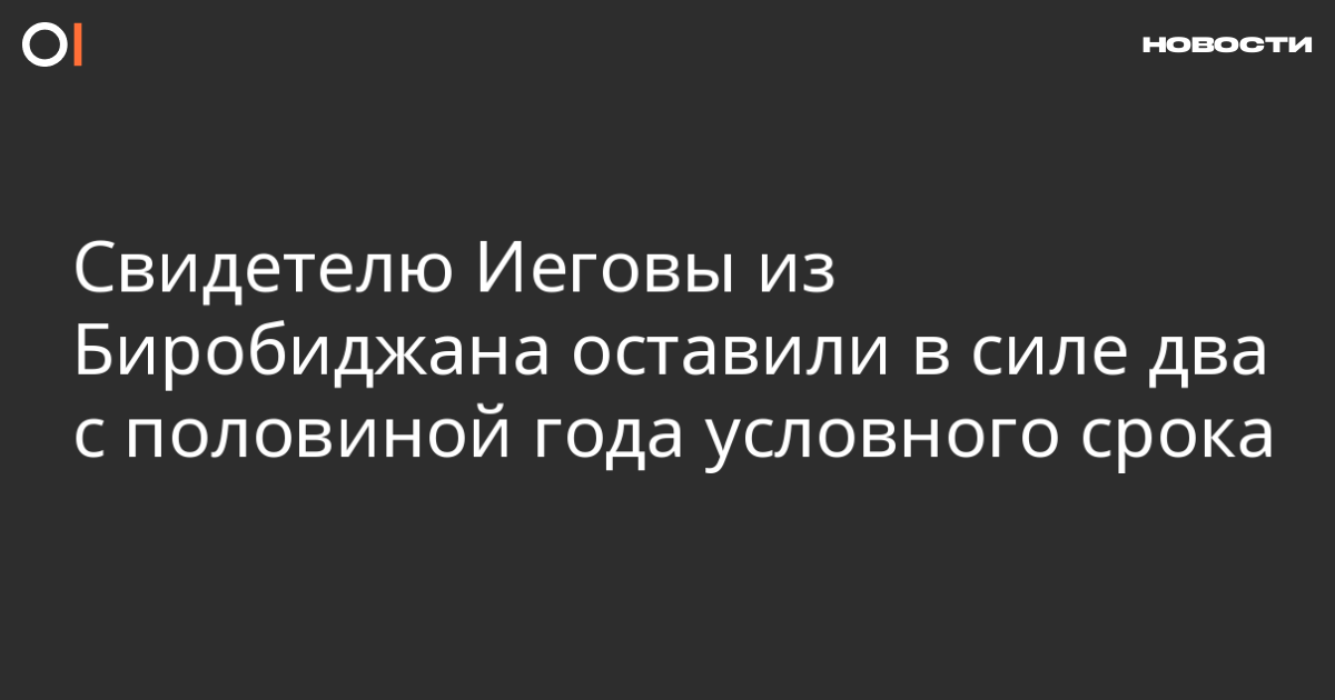 Суд Еврейской автономной области 8 апреля оставил в силе два с половиной года условно Свидетелю Иеговы из Биробиджана Артуру Лохвицкому. Об этом сообщает сайт, посвященный преследованию представителей конфессии.
