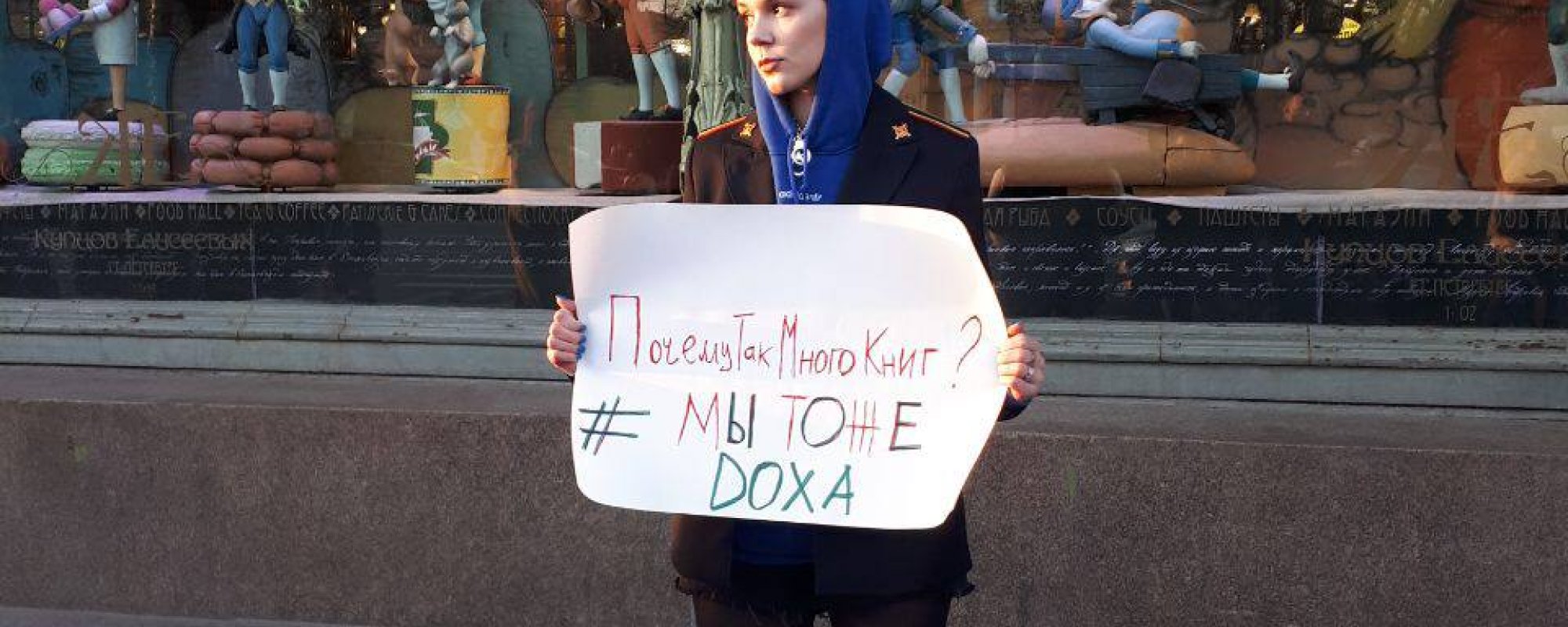Михайлова встала с плакатом «Почему так много книг? #МЫТОЖЕDOXA», при этом она была одета в форму полицейской, после чего ее задержали. Об этом она сама сообщила ОВД-Инфо.