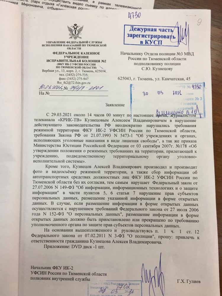 - В итоге полицейские снова приехали к Кузнецову и задержали его якобы из-за жалобы сотрудников колонии. Его отвели в отдел полиции и составили на него протокол, после чего отпустили.