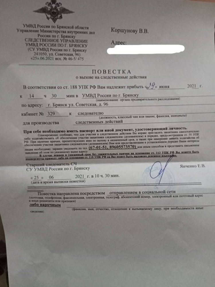 Коршунову вручили повестку о вызове на некие следственные мероприятия. Сотрудник полиции, который принес повестку, сказал, что активист является свидетелем в рамках уголовного дела по статье ст. 267 УК (приведение в негодность транспортных средств или путей сообщения). О каком именно инциденте идет речь, пока неясно.