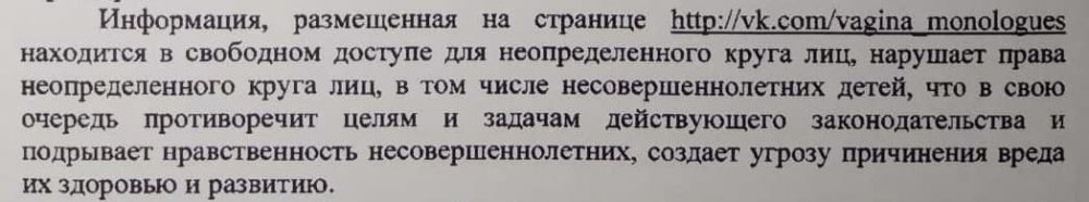 Согласно постановлению, которое есть в распоряжении ОВД-Инфо, в паблике «выявлена информация, причиняющая вред здоровью, нравственному и духовному воспитанию несовершеннолетних», в частности изображения женских половых органов. Речь идет о рисунках.