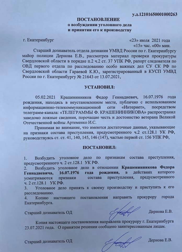 Дело связано с публикацией в телеграм-канале «Телеграммы Ф. Крашенинникова» от 5 февраля 2020 года: автор якобы намеренно распространял ложные сведения о 93-летнем ветеране Игнате Артеменко. Ветеран ранее был потерпевшим по делу о клевете, которое возбудили в отношении Алексея Навального.