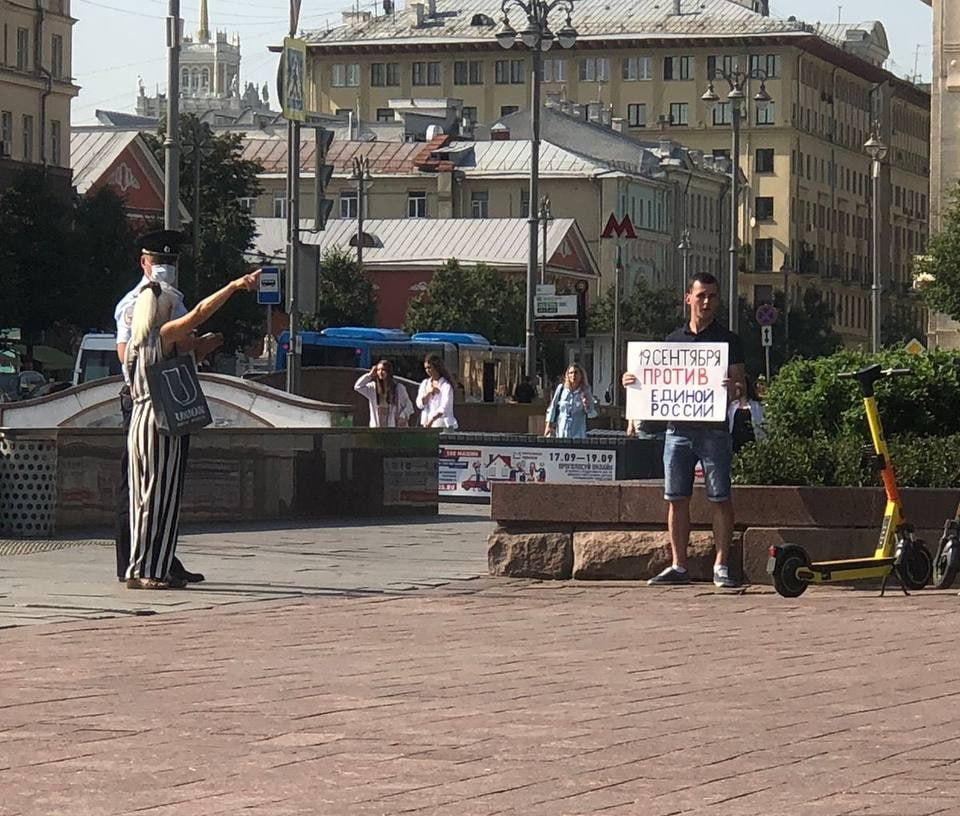 В Москве на Пушкинской площади задержали пикетчика Евгения Чачкова, который держал плакат против «Единой России». Об этом ОВД-Инфо сообщил сам Чачков.