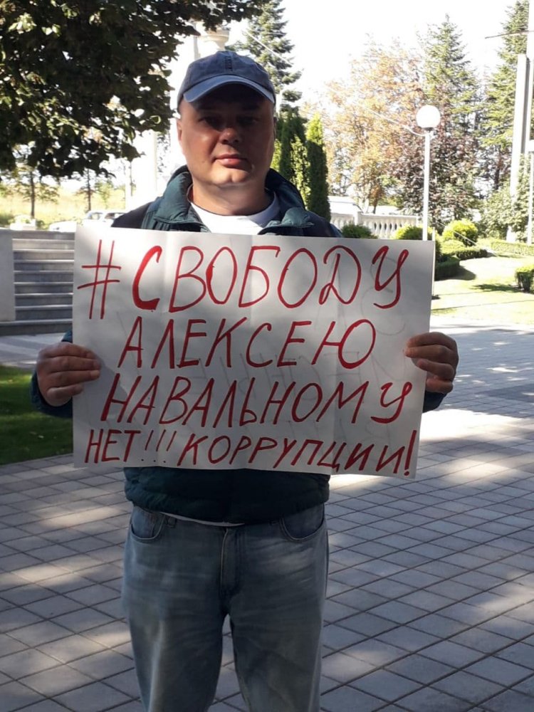 Активист стоял в парке Победы с плакатом «Свободу Алексею Навальному, нет коррупции». Его доставили в отдел полиции, после чего отпустили без протокола.