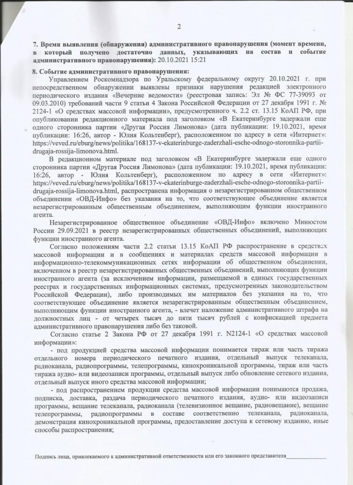 Управление Роскомнадзора по Уральскому федеральному округу составило на главного редактора екатеринбургских «Вечерних ведомостей» Владислава Постникова протокол по статье о злоупотреблении свободой информации из-за отсутствия маркировки о статусе «иноагента» при ссылке на ОВД-Инфо. Об этом Постников сообщил проекту.