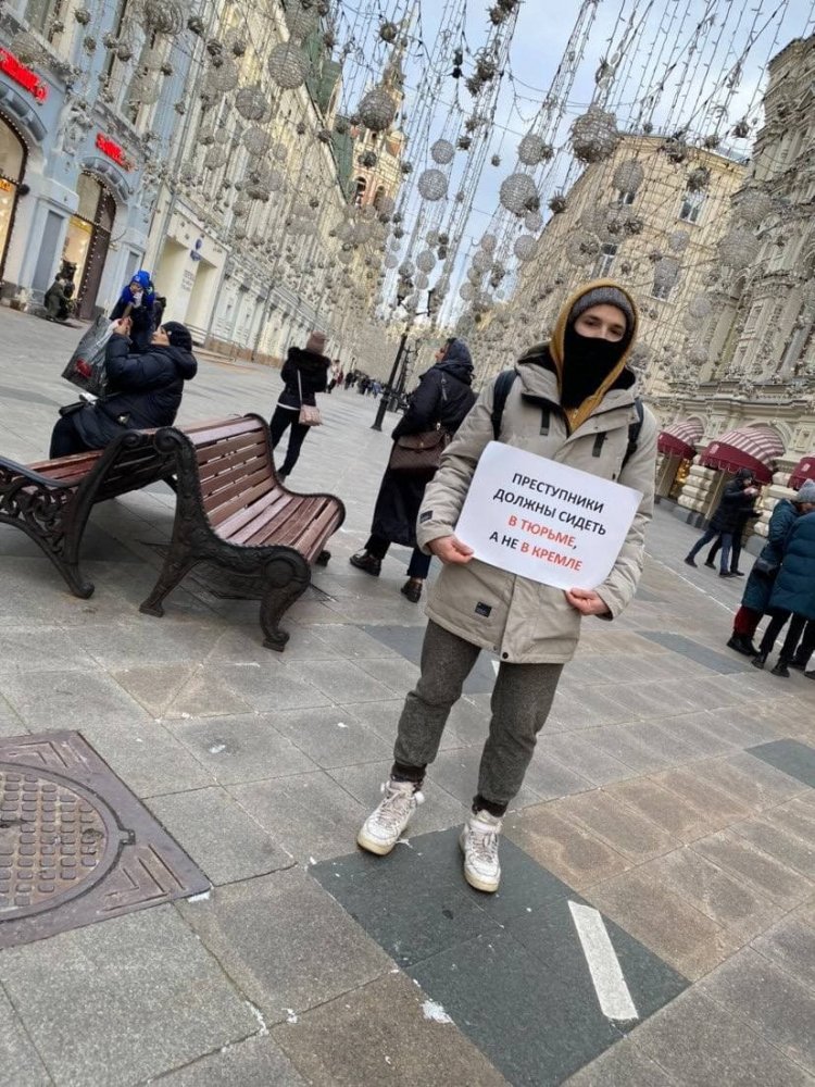 У Пинчука был плакат «Преступники должны сидеть в тюрьме, а не в Кремле».