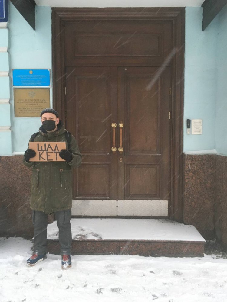 Мальгаждаров вышел на пикет к посольству с плакатом «ШАЛ КЕТ», что в переводе с казахского означает «Дед, уходи». Сотрудники полиции задержали активиста и увезли в ОВД Басманного района якобы для проверки документов.