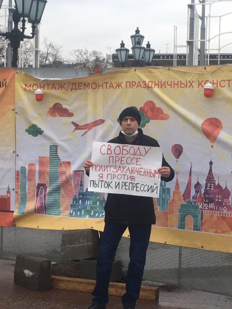 14:50 Задержали также Сергея Агаршева. Он пикетировал с плакатом за свободу прессе и политзаключенным.