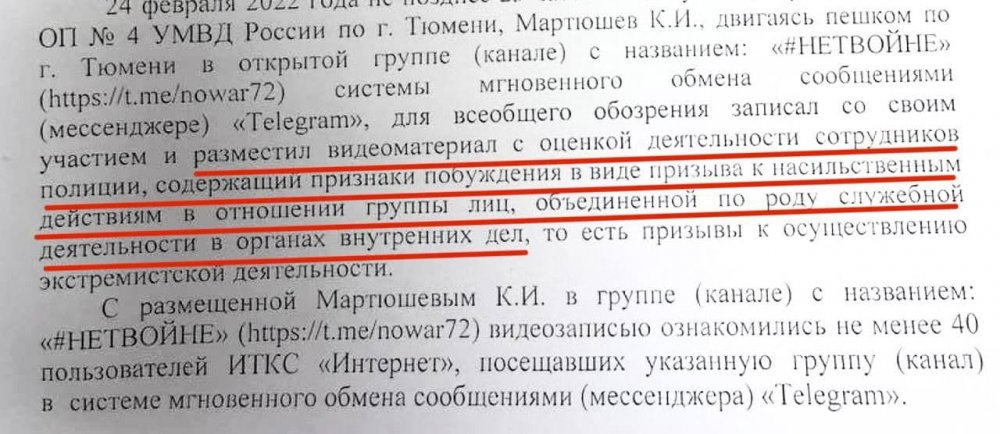 Мартюшева подозревают по статье о публичных призывах к экстремистской деятельности (ч. 2 ст. 280 УК). По версии следствия, 24 февраля активист разместил в телеграм-канале «#НЕТВОЙНЕ» видео с оценкой действия полицейских с признаками призыва к насильственным действиям против сотрудников органов внутренних дел. Следователь просил заключить Мартюшева под стражу на 1 месяц и 27 дней, до 4 мая.