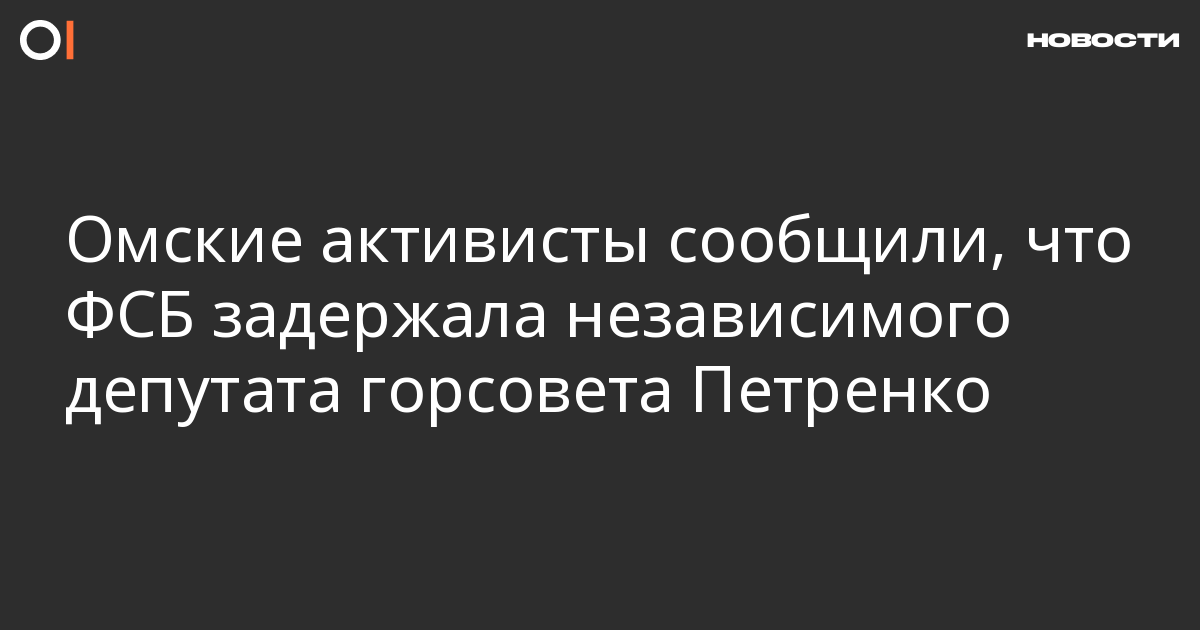 В Омске сотрудники ФСБ задержали независимого депутата местного горсовета Дмитрия Петренко. В настоящий момент он не выходит на связь, передает в твиттере «Омское гражданское объединение».