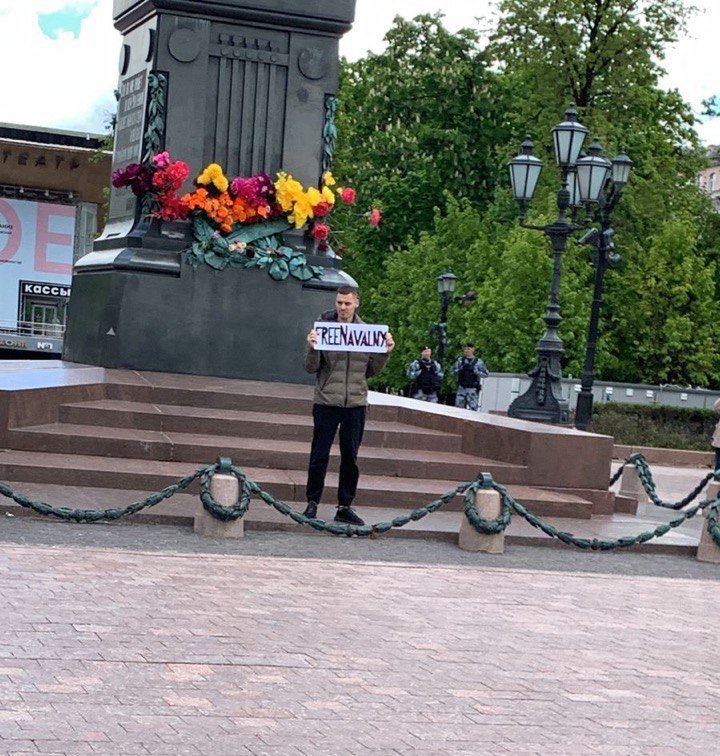В Москве на Пушкинской площади полиция задержала пикетчика Дмитрия Дробченко, который стоял с плакатом Free Navalny. Об этом он сам рассказал ОВД-Инфо.
