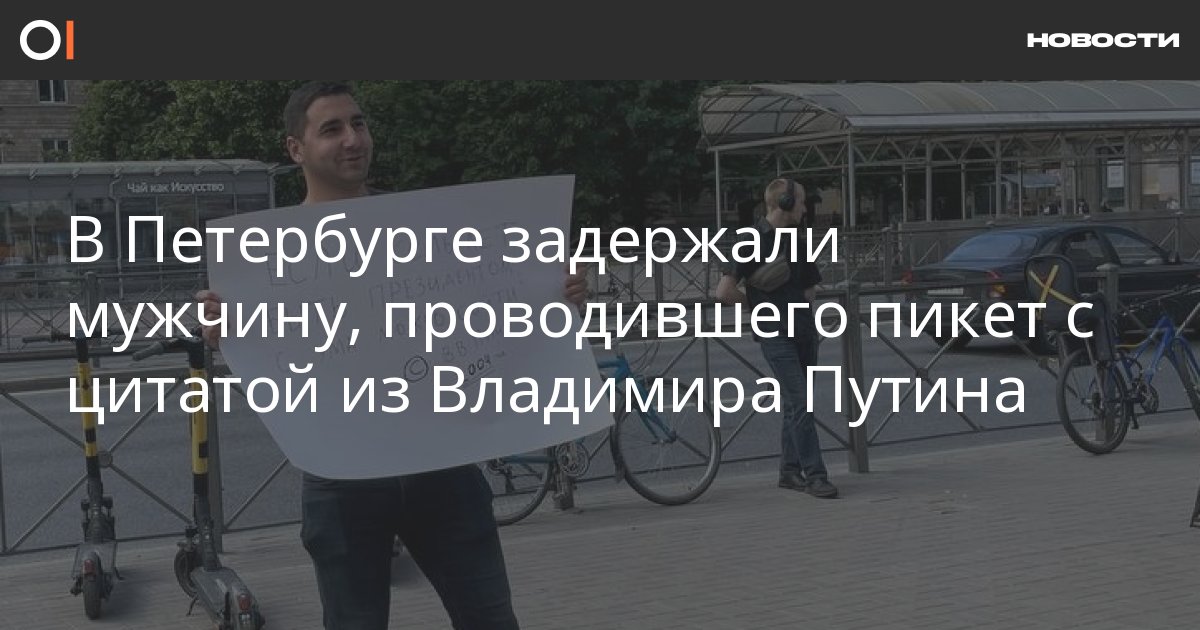В Петербурге задержали Андрея Оливьери, проводившего одиночный пикет с высказыванием, которое Владимир Путин сделал в 2004 году: «Если семь лет быть президентом, с ума можно сойти». Об этом ОВД-Инфо сообщила жена задержанного.
