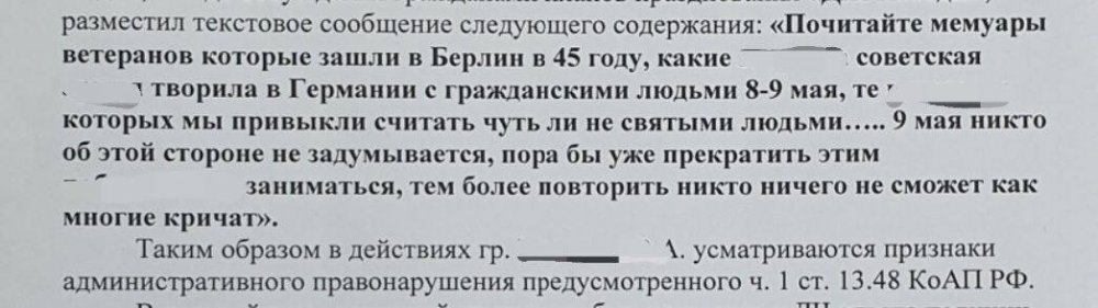 Мужчина предложил собеседникам почитать мемуары ветеранов, вошедших в Берлин в 1945 году. Скриншоты переписки попали к сотрудникам Центра «Э». Мужчину вызвали в отдел полиции на беседу.
