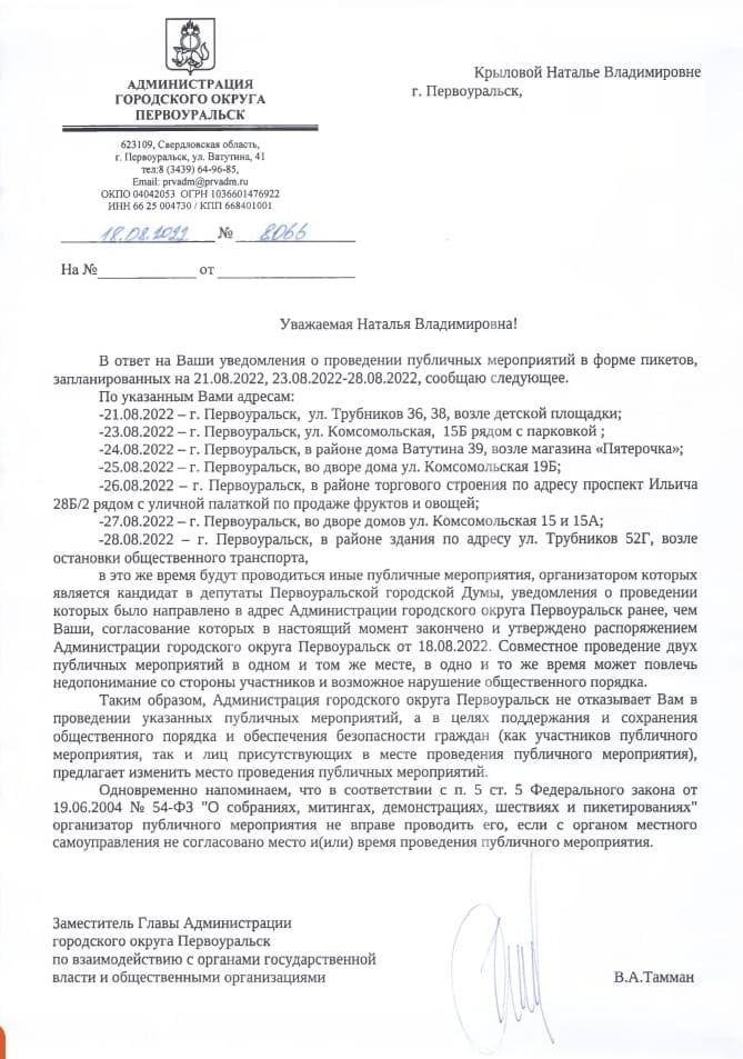 - 11 августа администрация согласовала Крыловой проведение агитационного пикета 14 августа. Однако на следующий день, 12 августа, это решение отозвали.