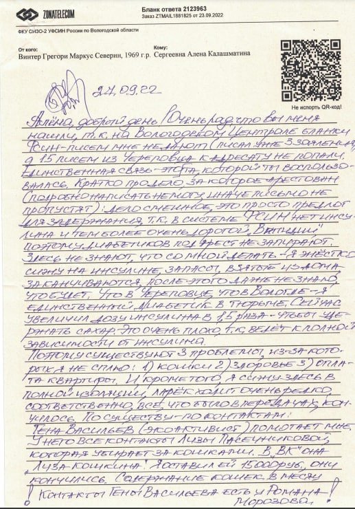 Письмо Винтера из СИЗО. Фото: SOTAvision