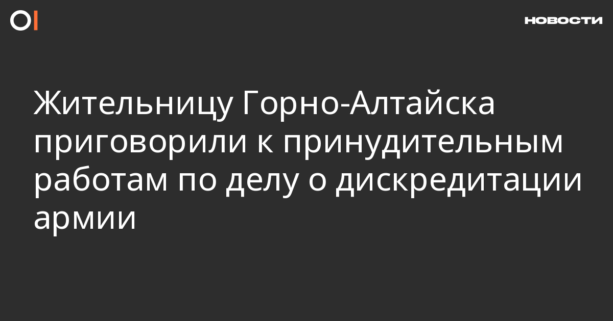 Горно-Алтайский городской суд 1 августа приговорил местную жительницу Ай-Тану Тугудину к восьми месяцам принудительных работ с удержанием 10% зарплаты в пользу государства по делу о повторной дискредитации армии (ч. 1 ст. 280.3 УК). Информация об этом опубликована на сайте суда.