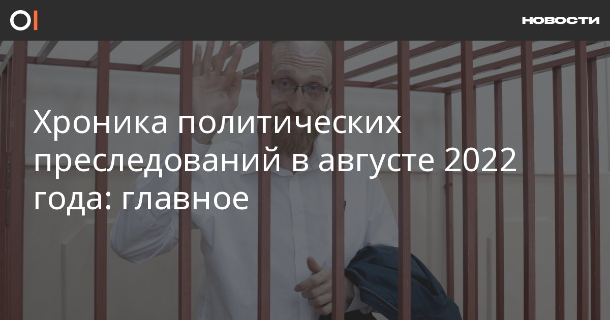 В августе чиновники не стали добавлять новых людей в список «иностранных агентов», но репрессий меньше не стало. Роскомнадзор продолжил блокировать сайты, на которых размещалась информация о войне в Украине, а силовики — заводить уголовные дела на тех, кто не согласен с проведением «спецоперации». Рассказываем о главных новостях политпрессинга за месяц.